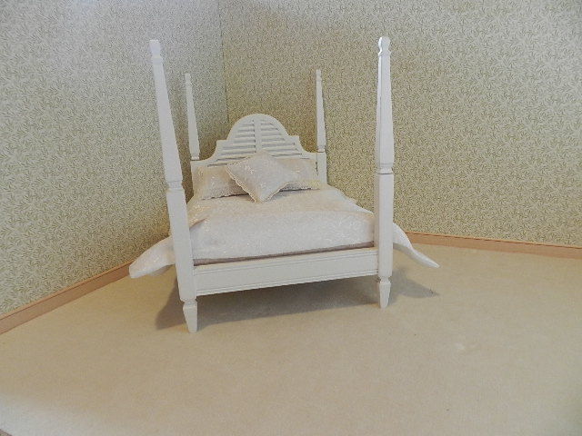 White Plantation four-poster double bed with white bedding.