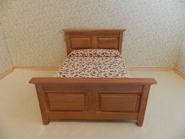 Walnut double sleigh bed with floral bedding.