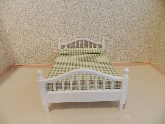 White double bed with green plaid bedding.