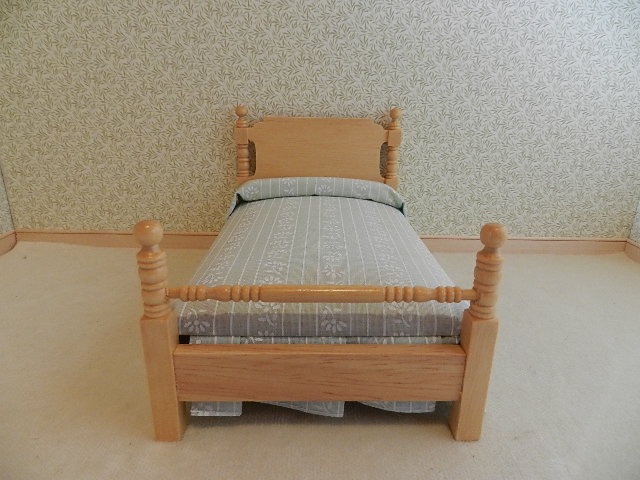 Lightwood single bed with pale blue & white bedding.