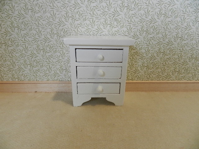 White bedside cabinet with three drawers.