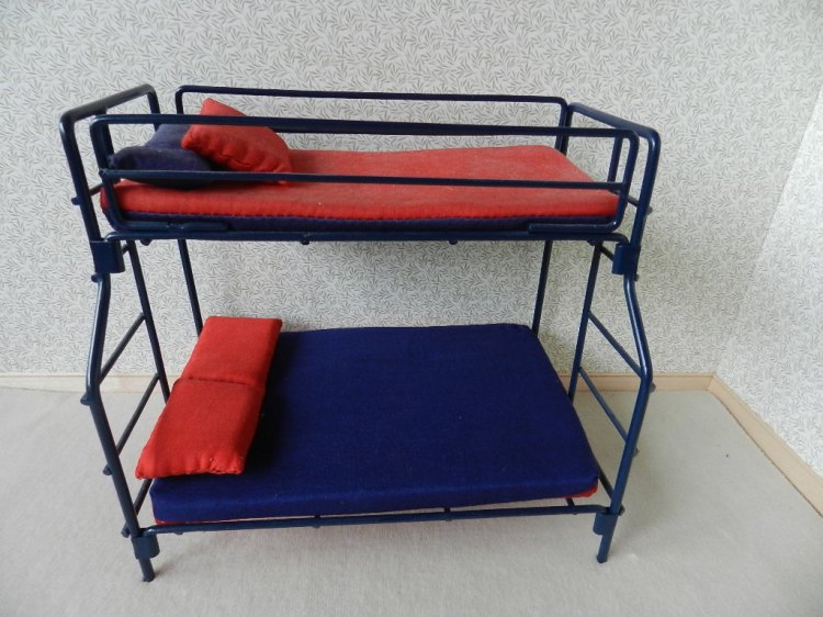 Dark blue metal bunk bed with mattresses &pillows.