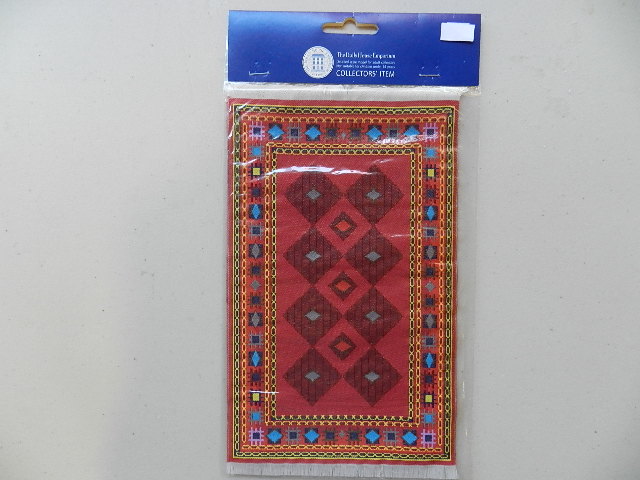Woven oriental red fringed rug. 16cm x 9.5cm