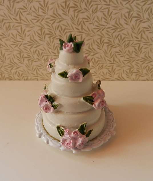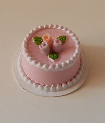 2 tier wedding cake, white icing with pink detailing. Round cake.