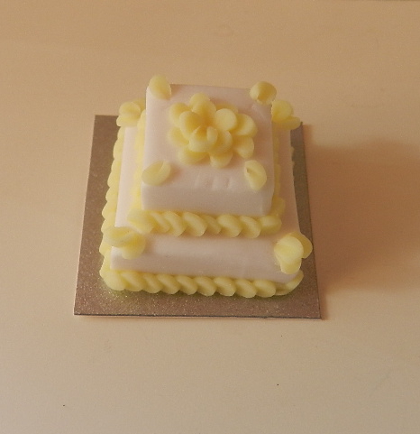2 tier wedding cake, white icing with lemon detailing. Square cake.