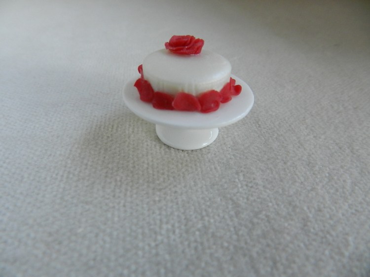 Round cake with royal icing and red rose & petal decoration. On a lovely pedestal white china plate.