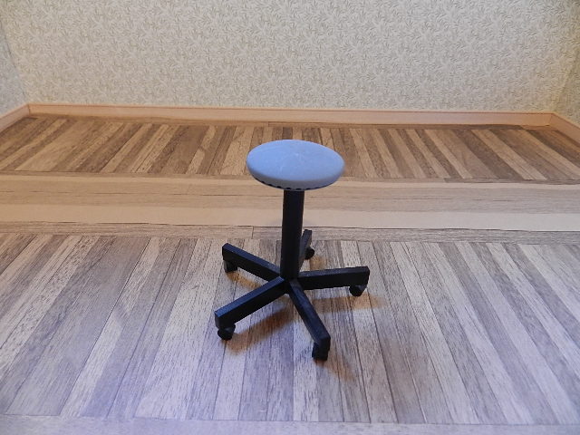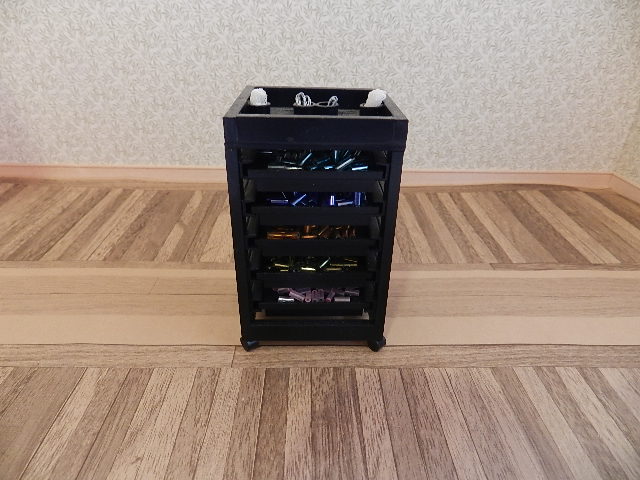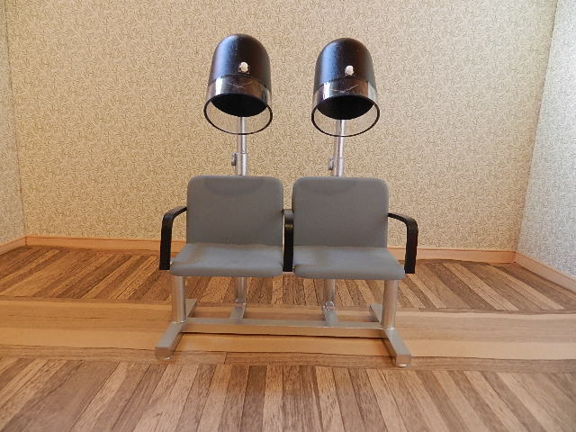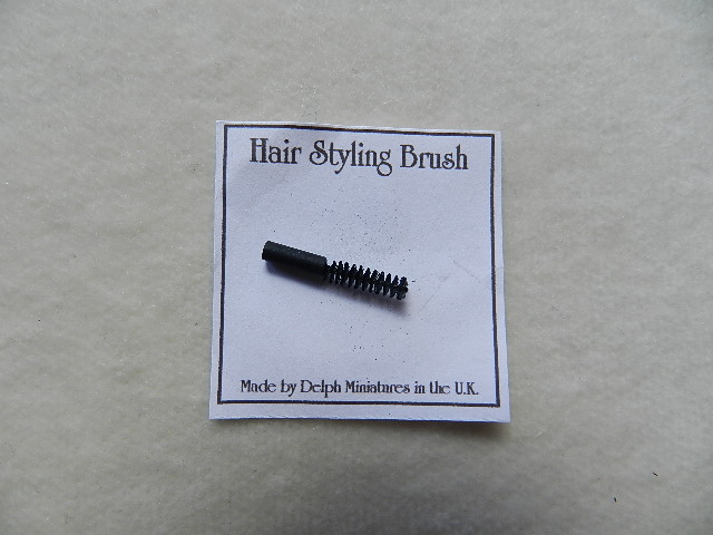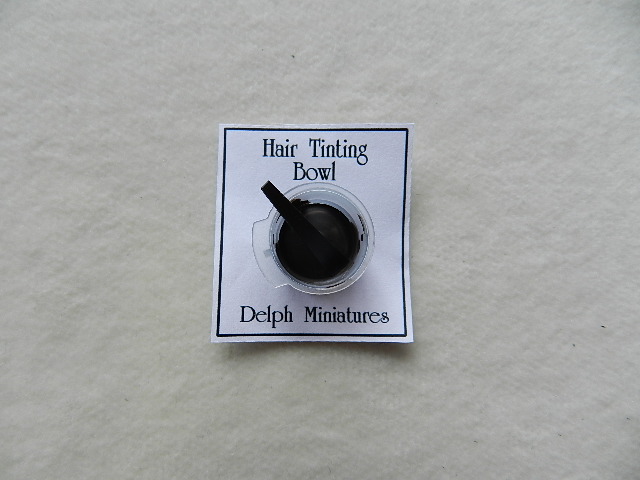 Black stylist’s trolley with curlers in pull out shelves, pins and nets by Delph Miniatures.