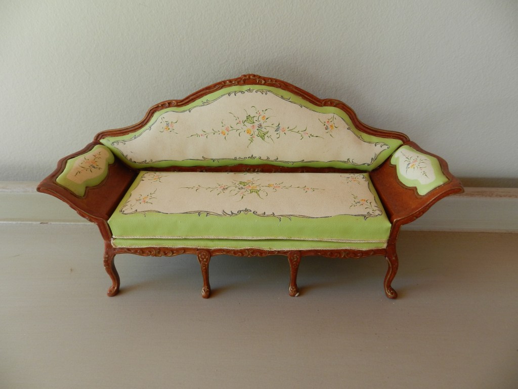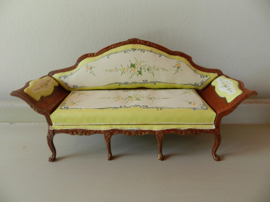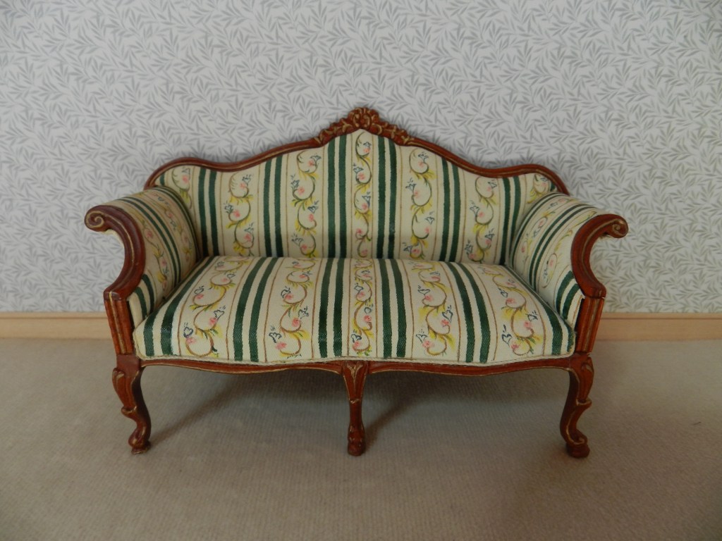 French walnut sofa with green & cream upholstery.