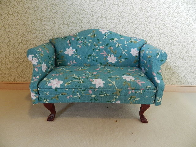 Green floral sofa with mahogany legs. Upholstered in a green floral fabric.