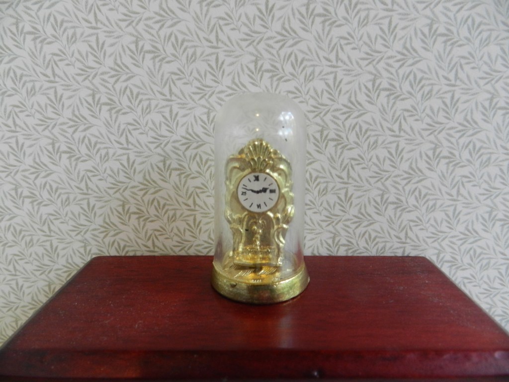 ‘Gold’ mantel clock with a glass dome. 4.7cmH x 2.5cmW