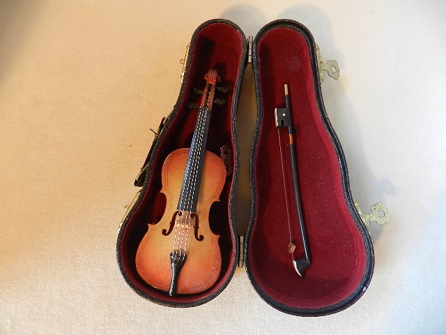 Bass in black ‘leather’ case lined with a red velvet fabric.