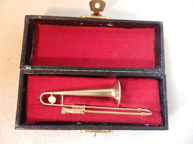 Trombone in black ‘leather’ case lined with red velvet fabric.