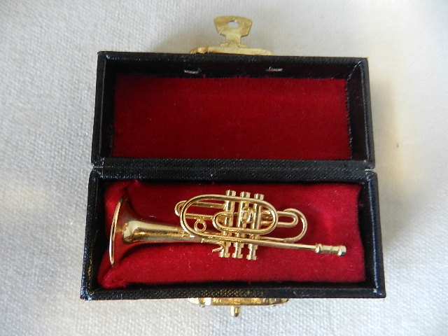 Cornet in black ‘leather’ case lined with red velvet fabric.