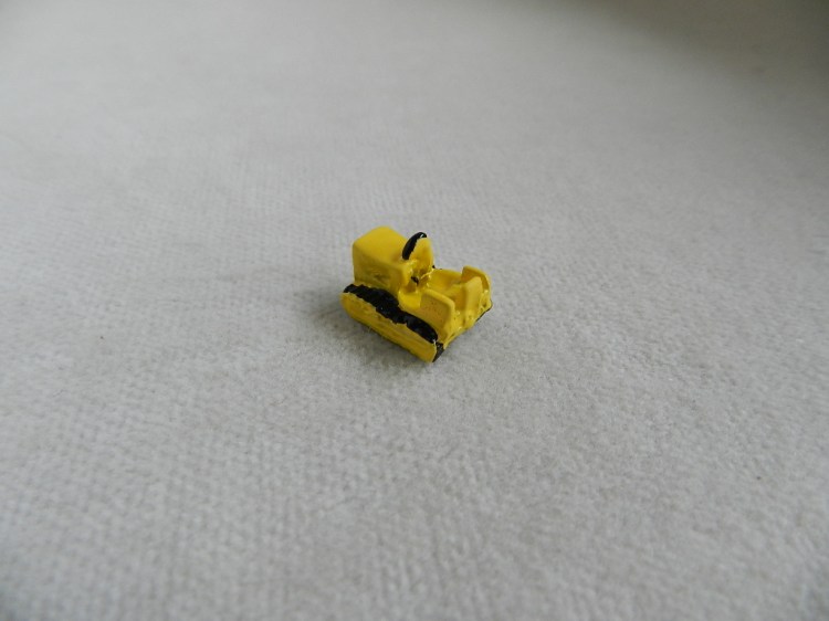 Yellow metal bulldozer. 1.5cm long x 1cm wide.