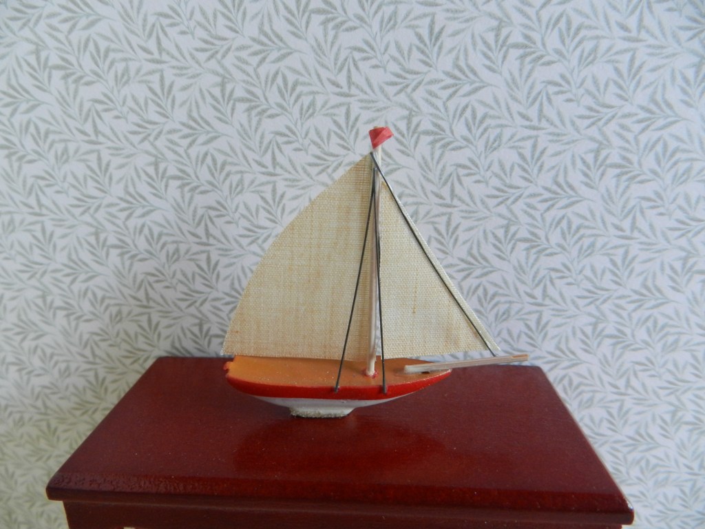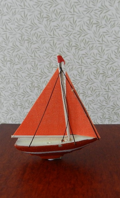 White & red sailing ship. 4.5cm high x 4cm long.