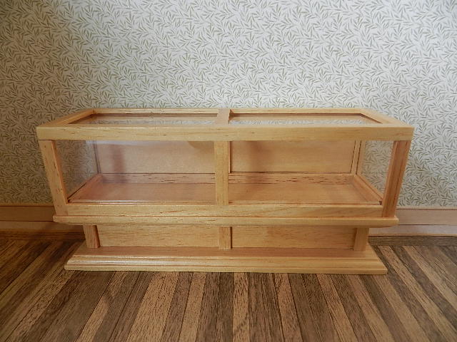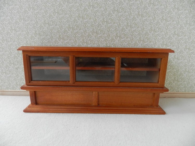 Lightwood shop counter with ‘glass’ display cabinet with sliding doors.
